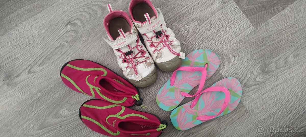 Nošené, ale v pořádku. Na donošení určitě poslouží. Sandály Loap, boty do vody Slobby a pantofle- celkem 100.-
