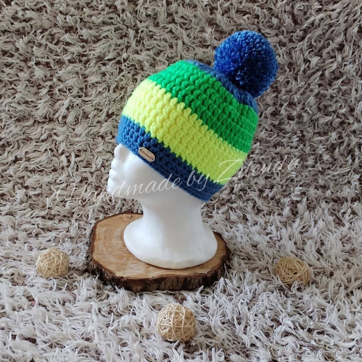Čepice má vlněnou bambulí, doplněna dřevěným knoflíčkem
