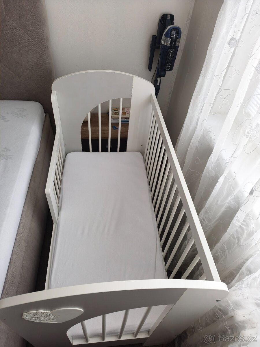 Prodám dětskou postýlku po jednom dítěti v klasických rozměrech (matrace 120*60cm). Včetně matrace, chrániče matrace, tří bavlněných bílých postěradel, mantinelu a setu polštářku a deky. Na postýlce je namontovaná samostatně kupovaná nízká bočnice již pro větší dítě, ale klasická bočnice je samozřejmě také k dispozici. Vše je čisté a bez poškození.