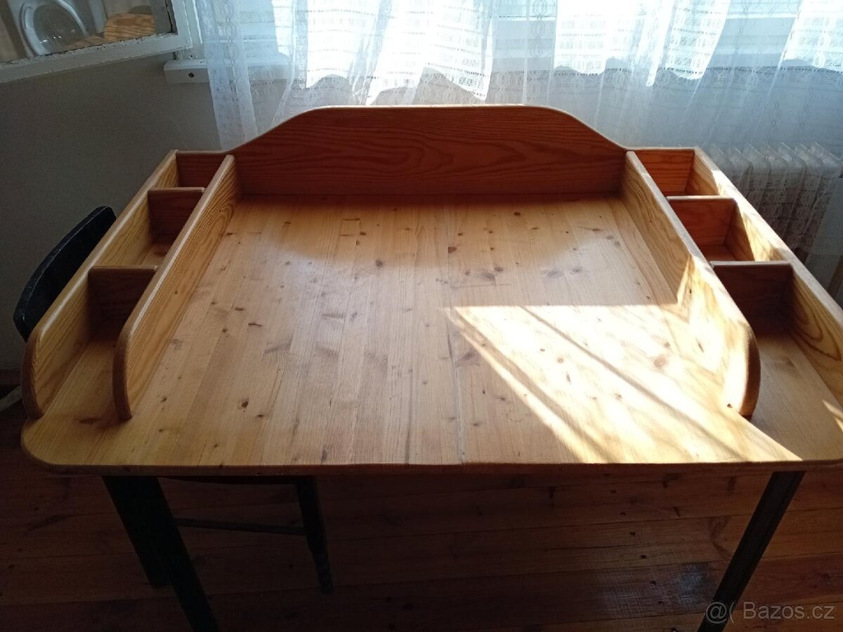Prodám dřeveny přebalovací pult po jednom dítěti. Je dělaný od truhláře na zakázku, rozměry přebalovacího pultu jsou 120 x 80 cm, v. 15 cm.
