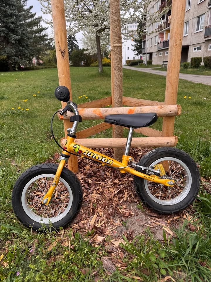 JUNIOR dětské odrážedlo (balance bike) s 12palcovými koly. Je určeno pro děti přibližně ve věku 2 až 4 roky a pro výšku dítěte zhruba 85 až 100 cm.