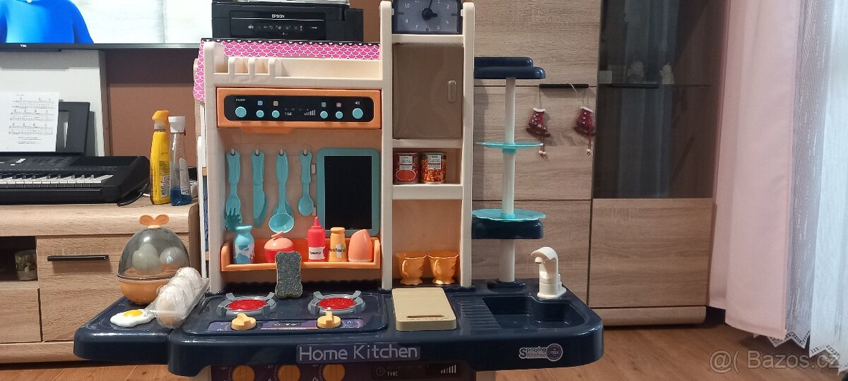 Nabízím hrací kuchyňku, se vším vybavením. Příbory, talířky, vařič vajček ( zvukový), trouba, lednice, spousta ovoce a zeleniny, 2 pánvičky, 2 hrnce.