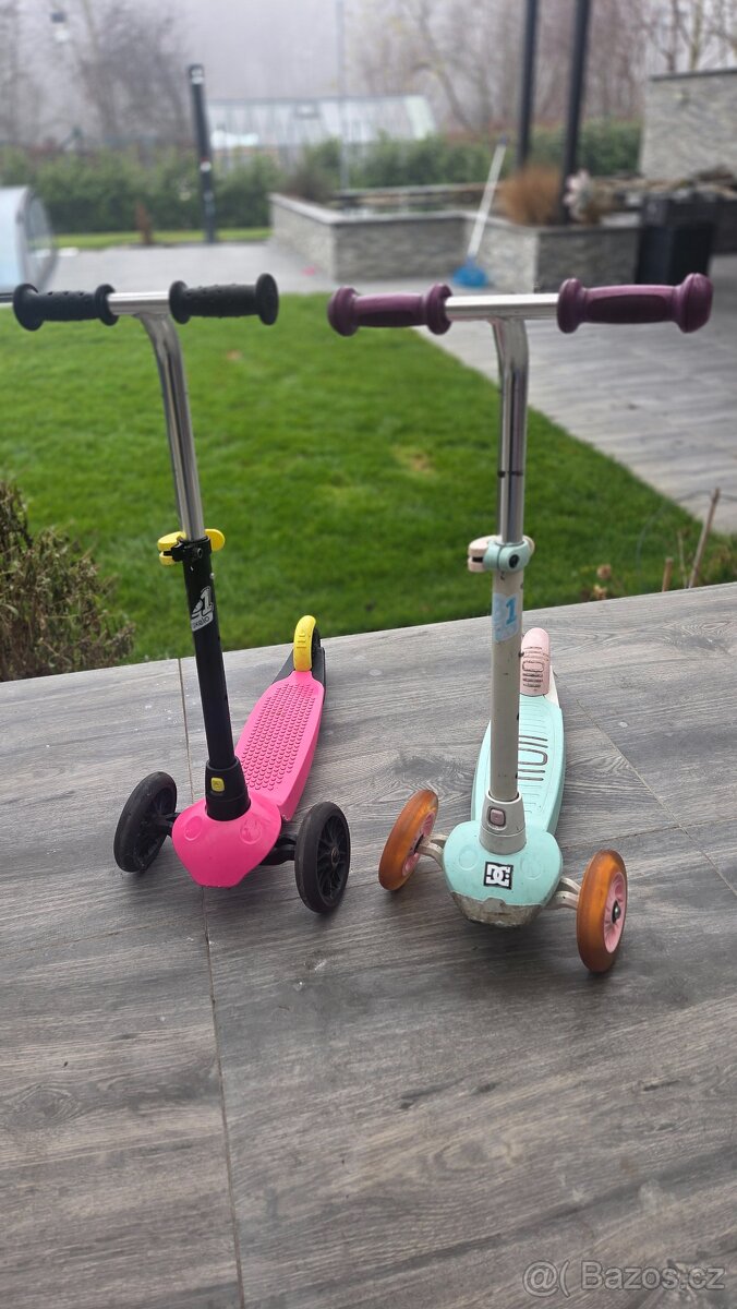 Prodám koloběžky použité ale stále krásně funkční. Růžová 350, tyrkysová 400 té svítí ještě kolečka.