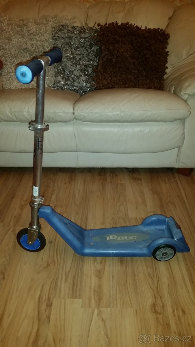 Prodám stabilní koloběžku pro děti do 4 let JD BUG KIDDIE KICK v dobrém stavu, ačkoli původní modrá barva vybledla, uvolnilo se náhradní kolečko a molitanové gripy jsou zteřelé. Tyto drobné vady ale na jízdě na koloběžce nemají vliv. Stáří koloběžky cca 8. let. Preferuji osobní odběr.