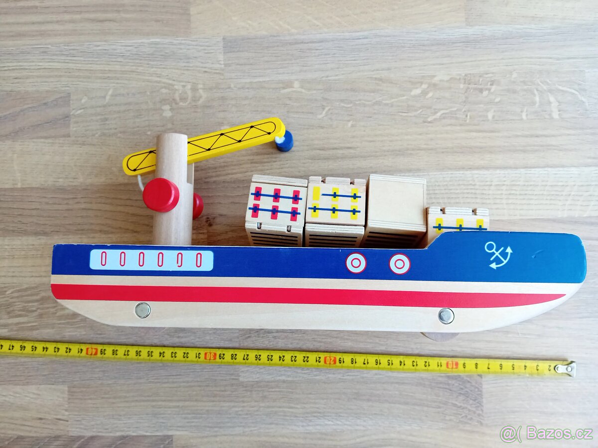 Dřevěná loď, na kolečkách, jeřáb s magnetem, na kontejnerech