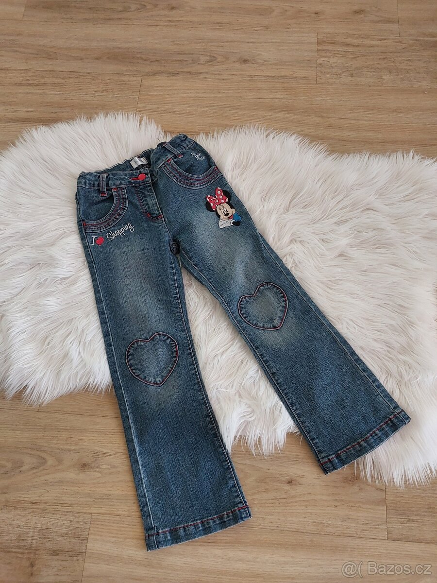 Nabízím roztomilé džíny pro malou parádnici s vyšitou myškou Minie a srdíčky na kolenou zn. CaA ve vel. 116 (5-6let). V pase mají utahování na gumu. Cena 99 Kč. Možné osobní předání v PLZNI nebo odeslání zásilkovna, balíkovna.