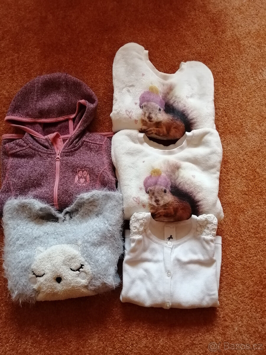 Prodám i jednotlivě: svetr bílý přes hlavu, vel. 116,Palomino, d.42 cm za 70 Kč a stejný vel.98 za 70kč, d. 41 cm. Svetr s kapucí,vel.98,zn. kiki, d. 40cm za 50 Kč. Svetr bílý rozepínací zn. Palomino, vel. 110, d. 40 cm za 50 Kč. Svetr šedy vel.116, zn.Palomino, v. 40 cm za 35 Kč