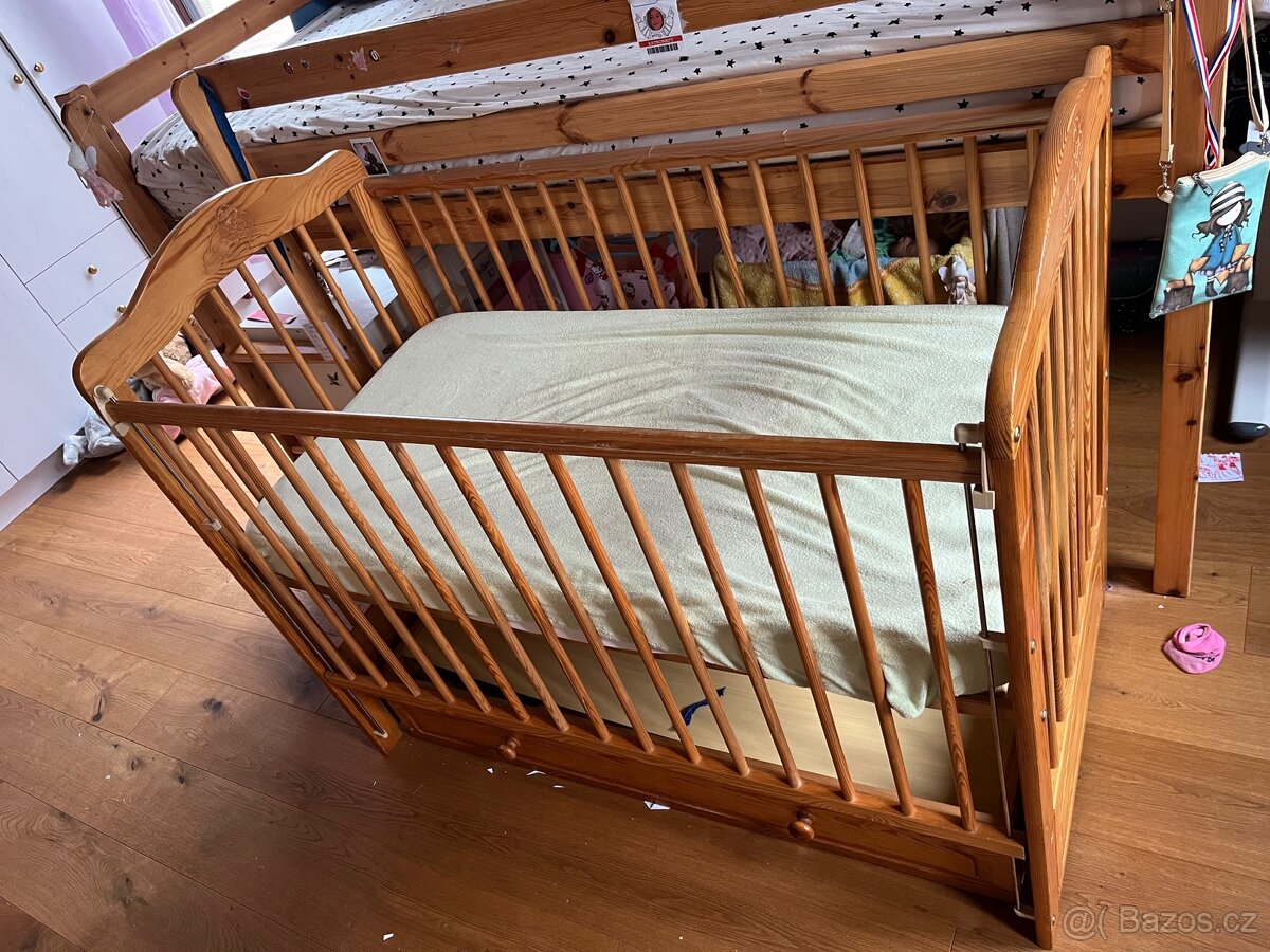 Dětská postýlka - [23.4. 2026]Prodám dětskou dubovou postýlku s matrací. Málo používaná, dítě v ní spalo párkrát. Rošt lze umístit do 3 poloh.