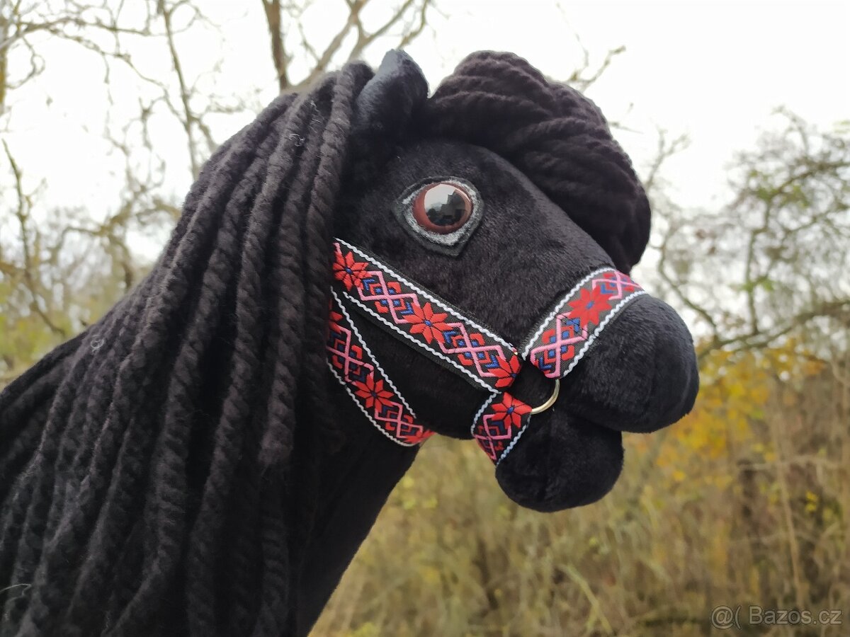 Prodám nového hobby horses černým lesklým kožíškem, s hnědýma očima a dlouhou černou hřívou. Tyč a ohlávka jsou v ceně, dokoupit lze otěže, vodítko nebo nákrčák. Prodávám s tyčí napevno vsazenou do hlavy. Celková délka je 67 cm, váha cca 500g.