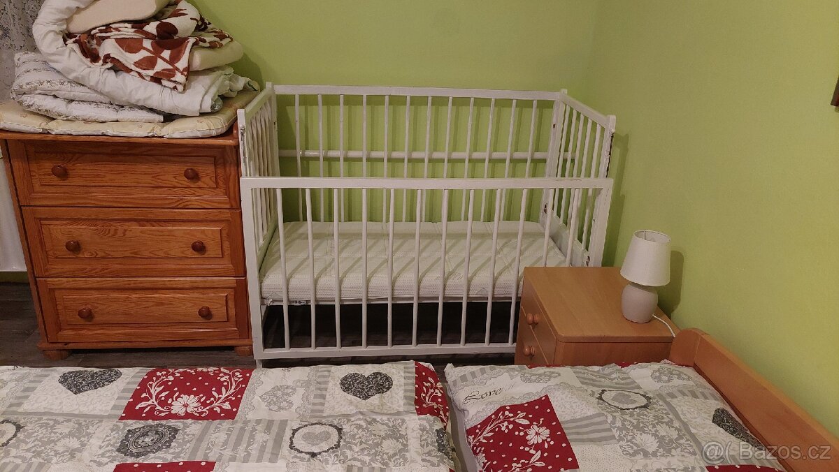 dřevěná postýlka s matrací - [18.4. 2026]rozkládací, již rozložená ,vlastní odvoz kousek od Rumburka