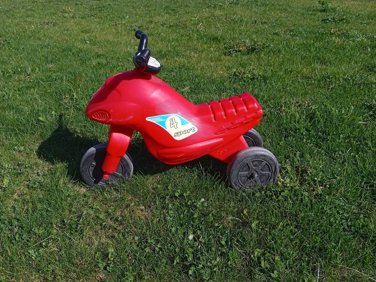 Dětské odrážedlo - červené auto - [7.3. 2026]Už toho hodně zažilo, ale ještě jezdí. Vyrobeno (kdysi dávno) v Německu, působí docela bytelně.