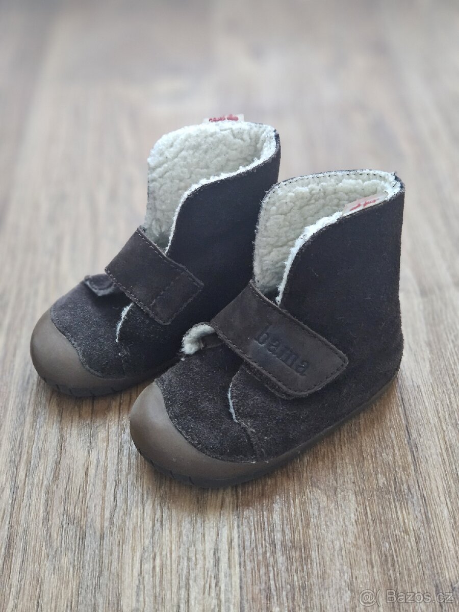 Zimní barefoot botičky, vel. 21 - [11.4. 2026]Zimní botičky Bobux, měkké, lehké a zateplené. Používané cca 3 měsíce. Podrážka na patách je viditelně opotřebená, ale na hřiště určitě ještě skvěle poslouží :) Semišové špičky jsou zašpiněné, umýt nejdou.