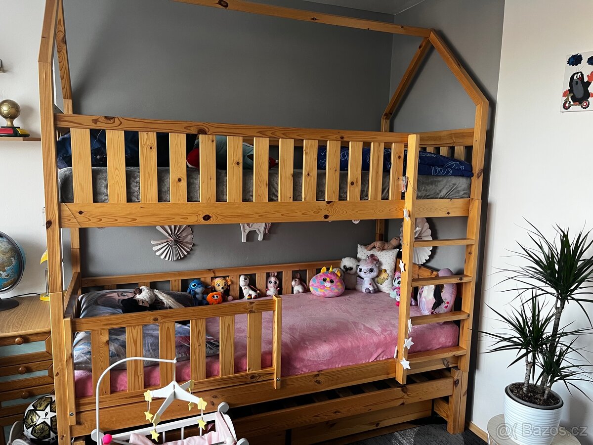 Dětská dřevěná palanda - [24.4. 2026]Dětská dřevěná palanda ve velmi dobrém stavu. Palanda je velmi pevná a stabilní, se dvěma úložnými pojezdovými prostory pod postelí. V ceně jsou rošty i matrace.