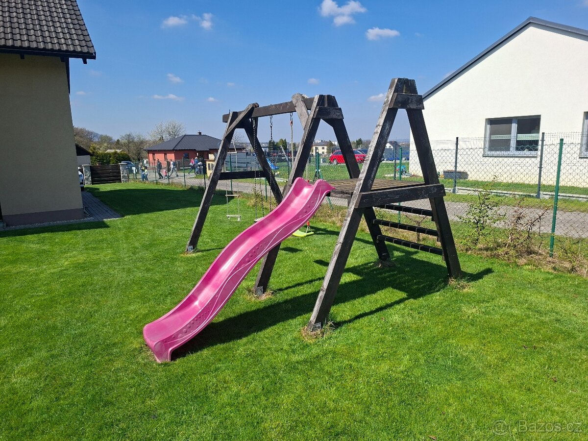 Prodám dětskou houpačku včetně skluzavky. Masivní konstrukce, stačí jen obnovit nátěr a bude jako nová.