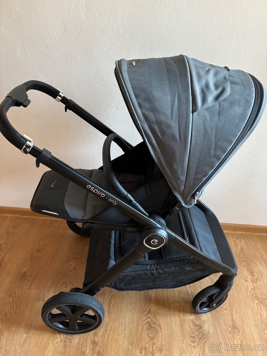 Sportovní kočárek Espiro Only Way , oboustrané sezení, dobře skladný, lehce složitelný, kožená vysunovací rukojeť, nosnost 20 kg, síťka ve stříšce, rozložitelná stříška, nánožník v ceně, držák na pití taky, velký prostor pod kočárkem uzavíratelný.