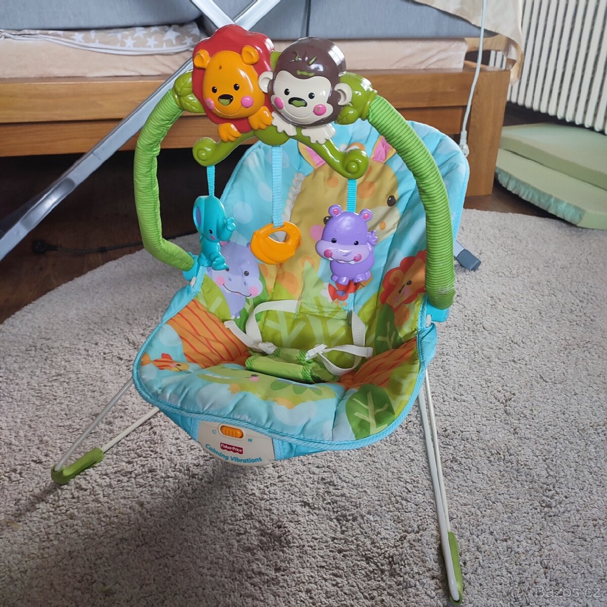 Značkové lehátko s krásnými motivy. Vhodné pro děti do 9 kilo. Možnost zapnutí jemných vibrací. (Baterie součástí) Prostřední hrací prvek po zatáhnutí přehrává 4 melodie. Běžné opotřebení bez skrytých vad. Viz foto. Originální krabice.