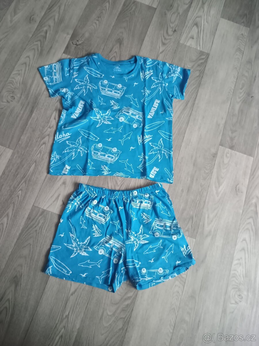 4x Pyžamo chlapecké kratký rukáv 152/158, teplaky, župan - [29.3. 2026]4x pyžamo na donošení, vel 164, ale je menší. Vše oblecení pro syna koupeno nové.