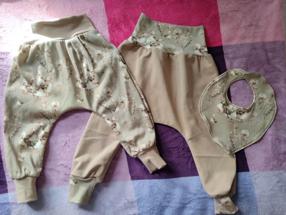 Nové mnou šité teplákové soupravy z nepočesané teplákoviny a žebrovaného úpletu plus oboustranný šátek.Velikost 68/74 délka tepláčků cca 50 cm.Od každé sady pouze jeden kus.Cena uvedena za jednu soupravu.Inzeruji i jinde