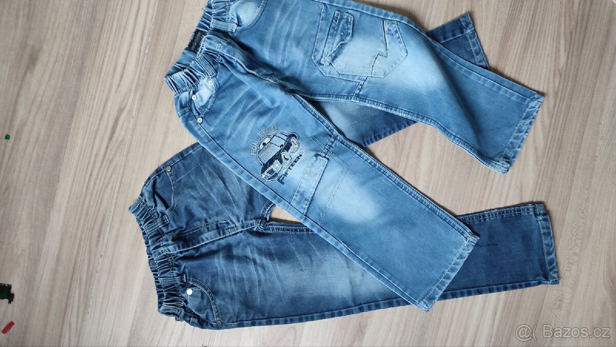 2x slim rifle 104/110 (dvojčata) - [25.4. 2026]Kiki Koko vel. 104, ale jsou větší, regulace v pase, barva odpovídá nejlépe druhé fotce, bez vad