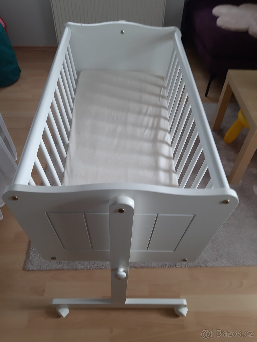 Postýlka/kolébka pro miminko - [22.4. 2026]🌱 Prodám dětskou postýlku/kolébku na kolečkách v TOP stavu - model Glory Petite and Mars. Veškerý textil na postýlce je vypraný v nontoxic Sonett sensitive. Postýlka je lemovaná hebkým plyšem, uvnitř pevná matrace, lze připevnit pásy k rodičovské pos ...