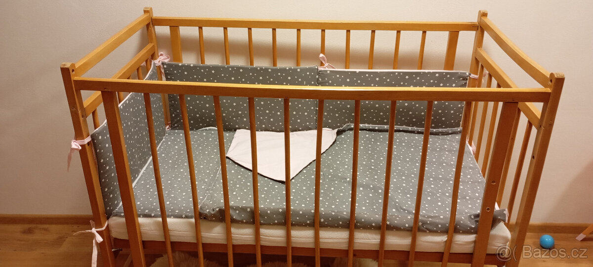 Prodám dřevěnou polohovatelnou postýlku s matrací, polštářkovými mantinely a povlečením. Rozměr: 120x80