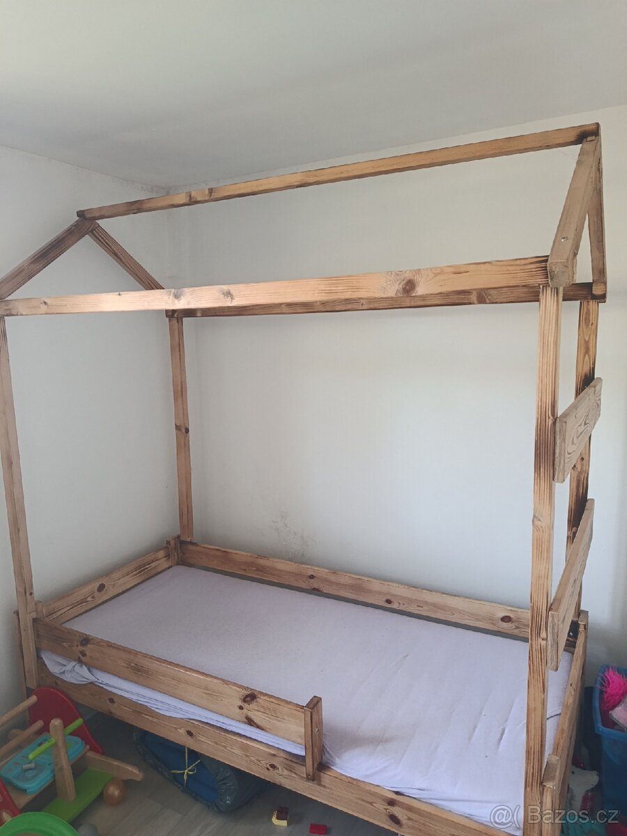 Zvýšená dětská postel - [26.4. 2026]K prodeji dětská postel o rozměrech: Délka 205cm, šířka 95cm (uzší konec) 115cm (u žebříku) a výšce 105cm.
