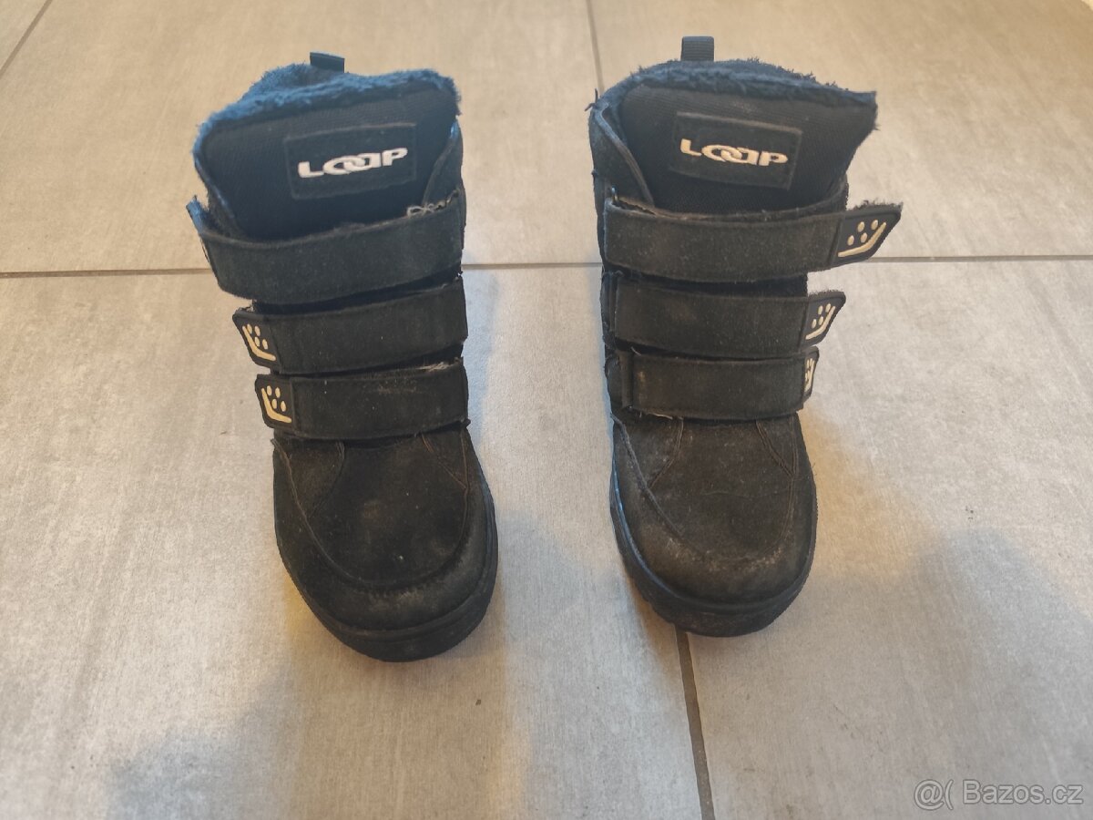 Nošená zimní obuv, stav viz foto, stélka je přilepená ( asi 18,5cm) , celková délka podrážky je 20,5cm. Suché zipy funkční,jen zevnitř pásky popraskané,nemá vliv na funkčnost. Velikost 29, že Sportisima. Předání: FNHK nebo mohu zaslat přes zásilkovnu (+89Kč)