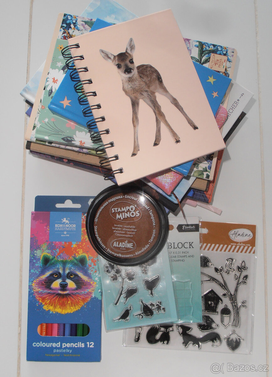 Nabízím k prodeji bloky, sešity, pastelky a razítka zvířátek s razítkovací hnědou barvou.