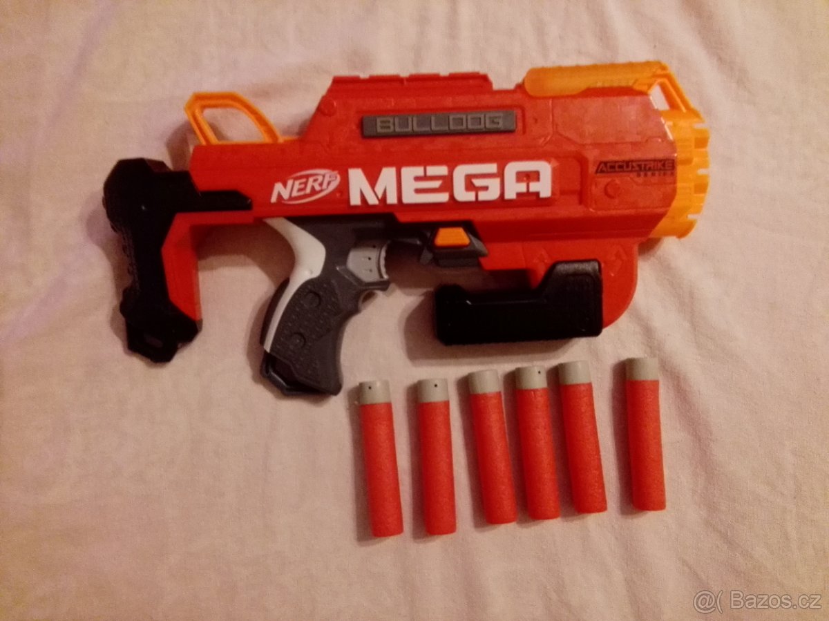 A.1 NERF Mega Accustrike Bulldog ze 6 mega accustrike šipky + 3 Mega Šipky. Cena: 400 Kč.