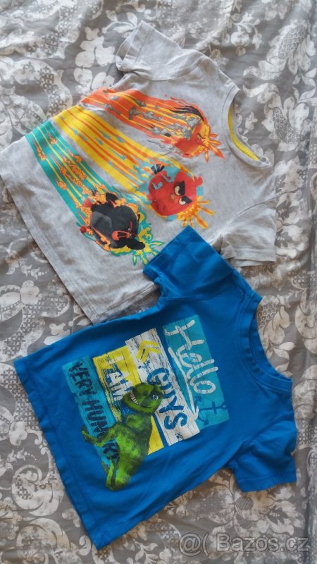 Trička vel.98 Angry Brirds značky CaA a dinosaurus Dopodo, velikost uvedena 104, ale jsou menší, délka 38cm a šířka 30 cm. Cena celkem 40 Kč.