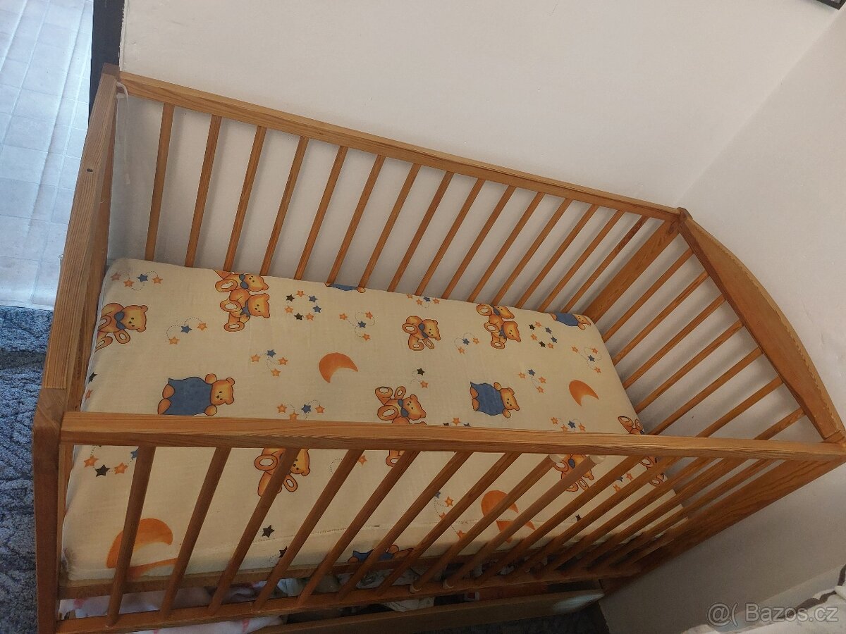 Prodám zachovalou starší postýlku se šuplíkem. Na boku dvě tyčky které lze vytáhnout. Včetně matrace.