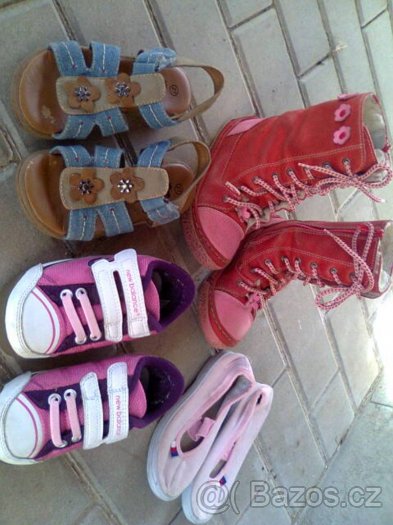 Prodám dívčí růžovofialové botasky, zn. New Balance, vel. 22,5, jako nové. Riflové sandále , zn. Bubble gummess, vel. 27, pěkné. Při odběru všeho přidám zdarma cvičky Jarmilky, vel, 26. Zimní boty jsou prodané.
