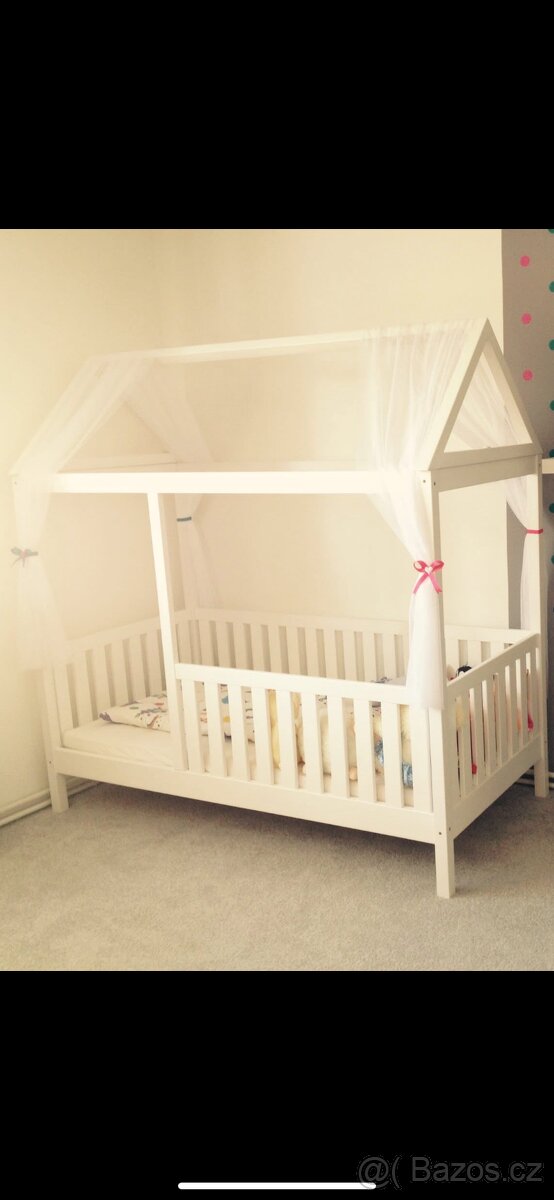 Postel pro děti ve stylu domečku. Vyrobená z masivu místním truhlářem. Postel je ve velmi dobrém stavu a je čerstvě natřená. Je bytelná, pevná a stabilní (žádné vrzání). Boční plůtek u vchodu je odnímatelný, takže postel lze upravit i pro větší děti. Pod postel lze umístit boxy cca 10 cm vysoké. Rozměry: 90 x 180 cm. Matrace je v ceně.