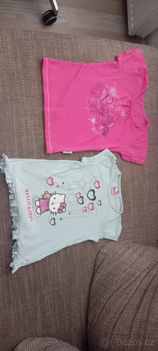 2× tričko krátky rukáv. Růžové je psaná velikost 122, skoro nenošené. Tričko s Hello Kitty je velikost 104/110 (neodpovídá), takřka nenošené. Cena za obě. Možno kupovat i jednotlivě.
